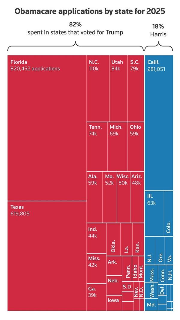 This morning, the Twitter account NewsWire_US, which claims to be a "U.S. and world news aggregator," posted an amazing-looking graph which purports to break out "Obamacare applications by state for 2025" by states which voted for Donald Trump vs. those which voted for Kamala Harris last month.