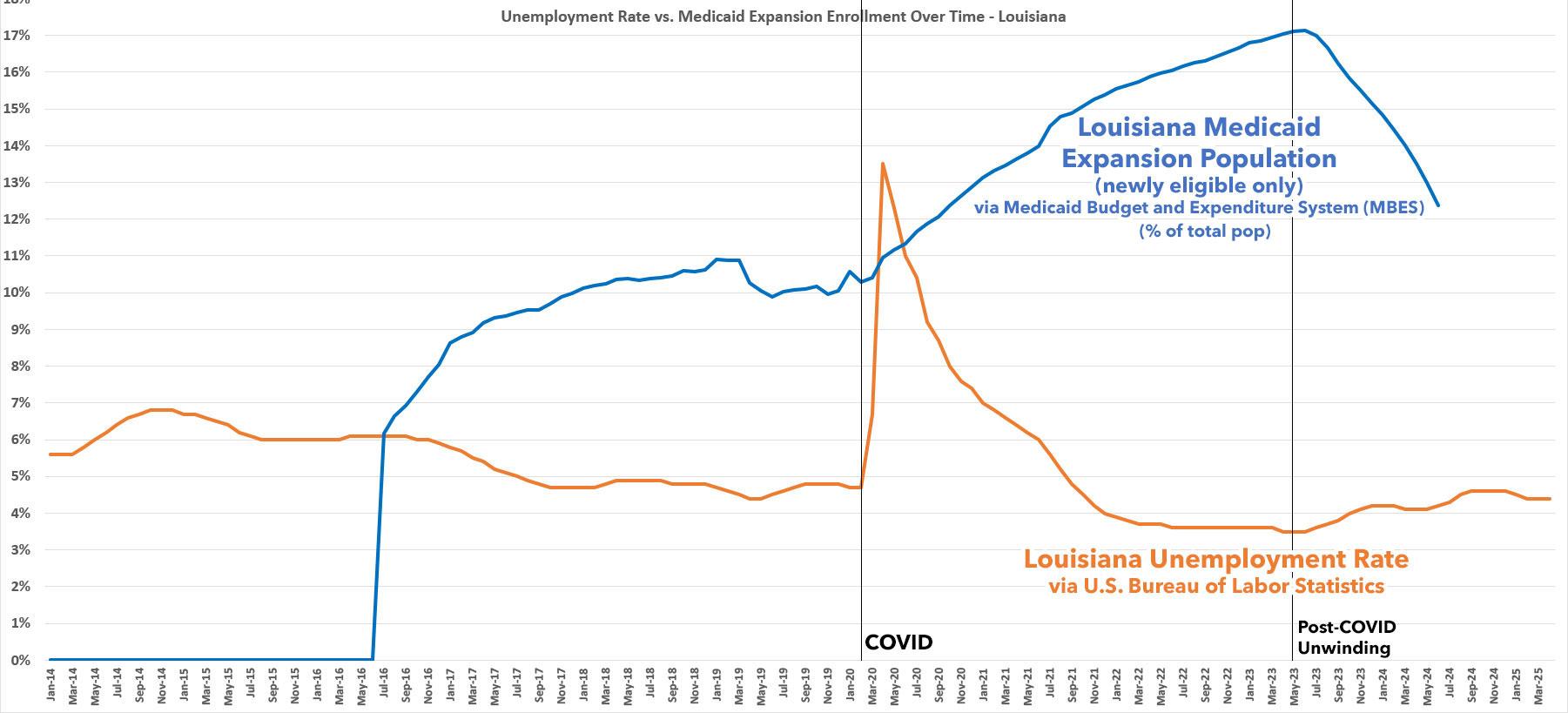 Louisiana expanded Medicaid starting in July 2016, and enrollment has grown from 0% to over 17% of the state's total population...so you'd think the unemployment rate would have risen to some degree over the past 9 years as well, right?