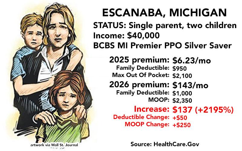 - A single mother with 2 young children living in Escanaba earning $40K/year
