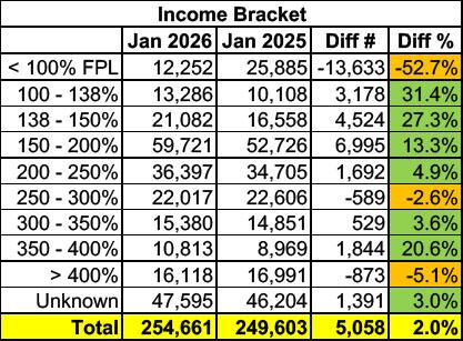 It's worth noting that over 25,000 of the < 200% crowd actually earned less than 100% FPL last year; just about all of these were likely documented immigrants who have lived in the United States for less than 5 years, which the ACA made eligible for federal tax credits until the OBBA bill was passed by Republicans lasts summer.