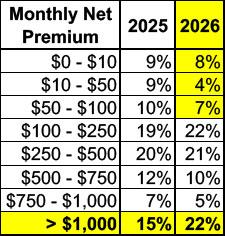 - Enhanced financial savings expired – Those who remain eligible for financial help are paying a similar net premium in 2026 compared to 2025. This is largely attributable to more consumers purchasing Bronze plans, and the overall CoverME.gov population having lower household incomes in comparison to the population enrolled last year. For those ineligible for financial assistance, monthly premiums rose by 33 percent. Furthermore, 22 percent of enrollees are paying more than $1,000 per month for their coverage (compared to 15 percent in 2025), and nearly 40 percent are paying premiums higher than $500 per month (compared to 33 percent in 2025).
