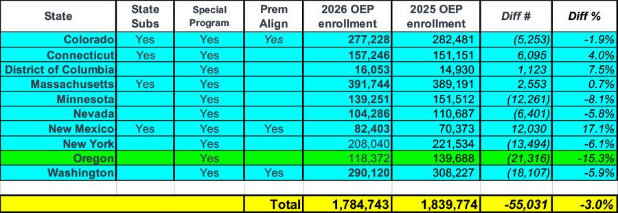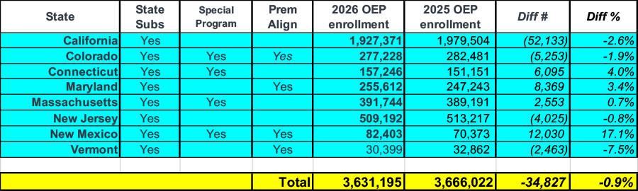 Across the 8 states which have dedicated state-based supplemental premium subsidy programs, total enrollment is only down 0.9% year over year.
