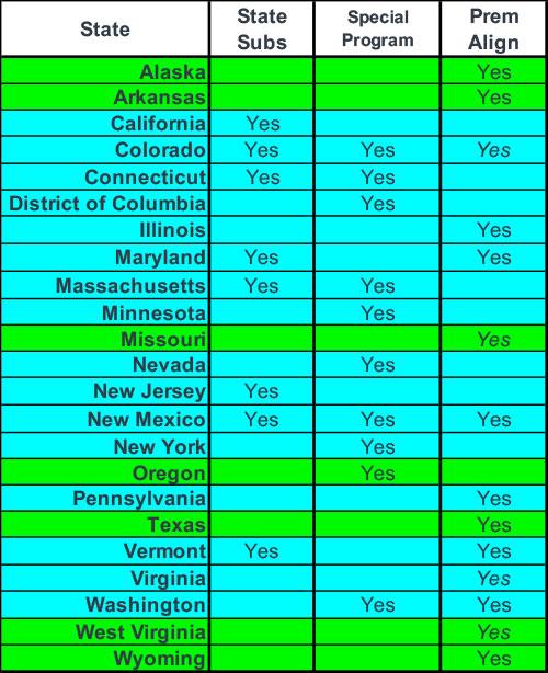 • Some states have robust Premium Alignment policies (Alaska, Arkansas, Illinois & Vermont) while others are fairly weak (Colorado, Maryland, Missouri & Virginia).