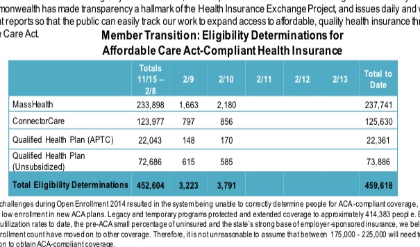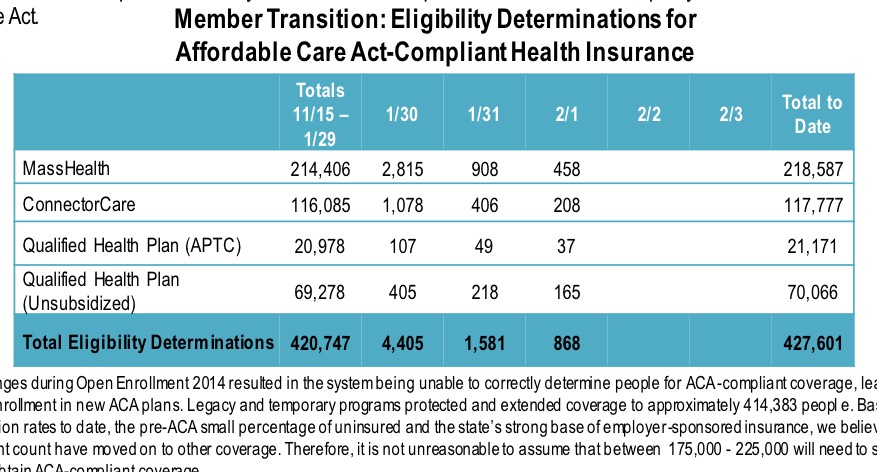 It's important to stress that this is not the final enrollment report for Massachusetts; it's the final daily report, which only includes the number of people determined eligible to purchase a private policy (Medicaid enrollees, however, are instant-activation; the number listed here is the number actually enrolled as of that day).