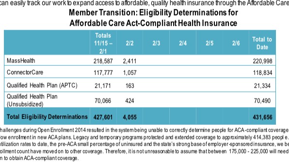 This isn't an exact apples-to-apples comparison, since the Massachusetts number includes the "overtime" extension period while the other 5 states only run through 2/15/15, but I thought it would be useful to see how the 6 exchanges which had widespread technical issues last year fared this time around. Obviously other states like Washington and California had some snafus, but these are the ones which were seriously hosed last year to the point of requiring massive overhauls or which were completely scrapped in favor of a new platform (I'm not including HC.gov itself here since everyone already knows what massive technical improvements they've made).
