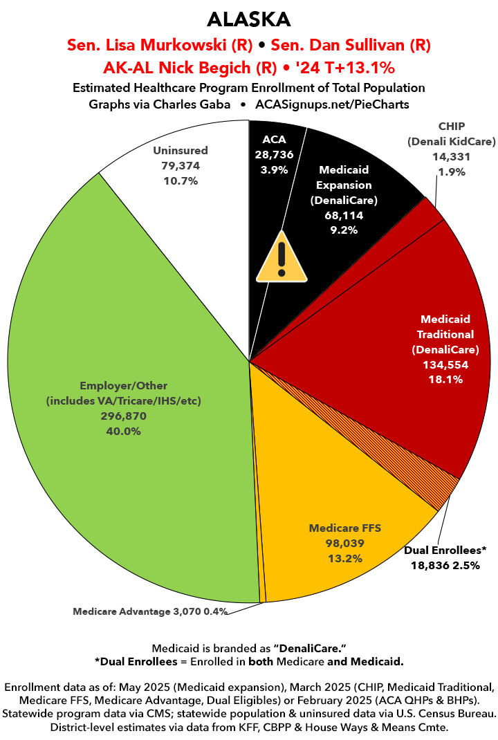 UPDATE 7/1/25: I've updated the web graphic with the most up-to-date enrollment data I have access to. The black sections w/the ⚠️ symbol are those most at risk of losing healthcare coverage due to H.R. 1, the "One Big Beautiful Bill Act" (aka the #MAGAMurderBill).