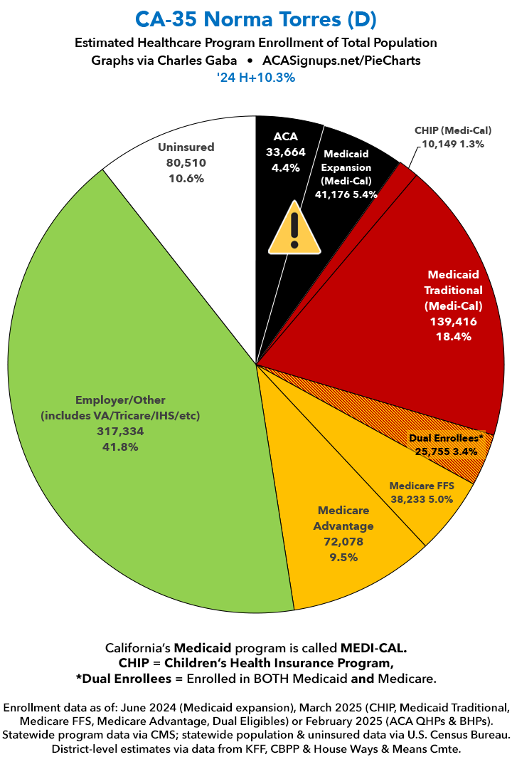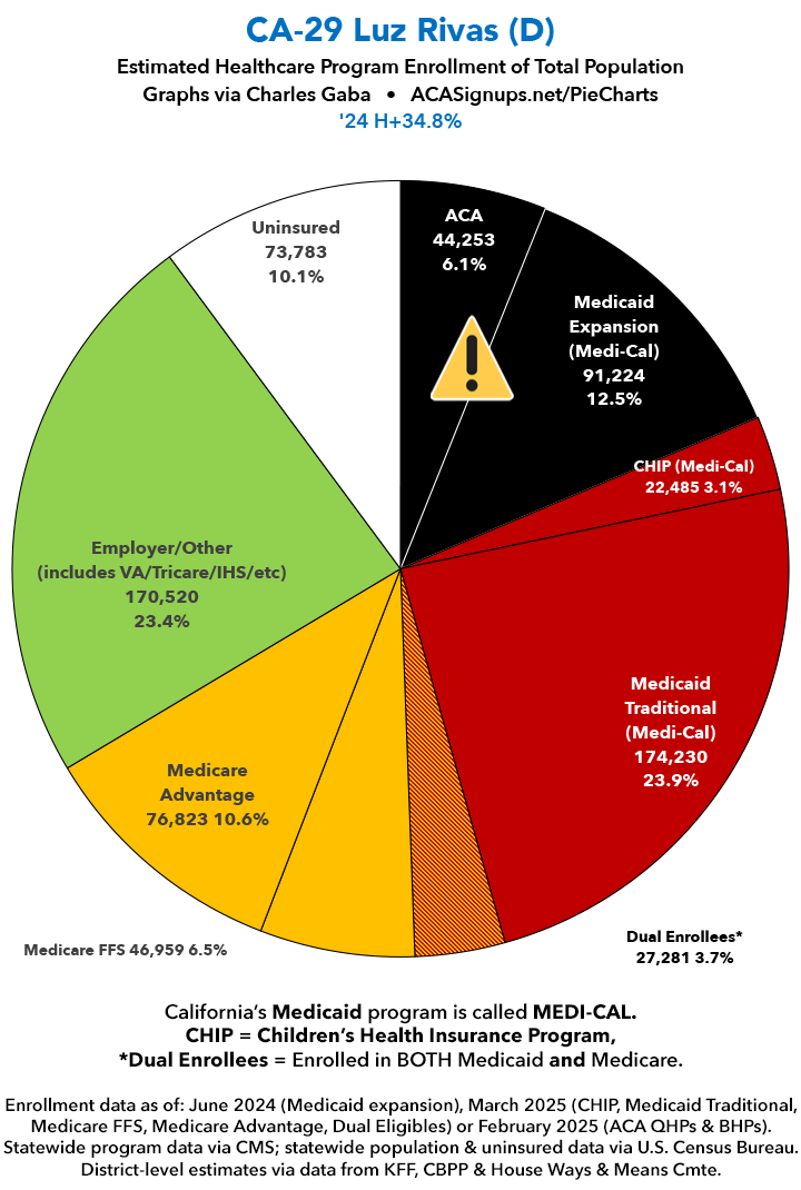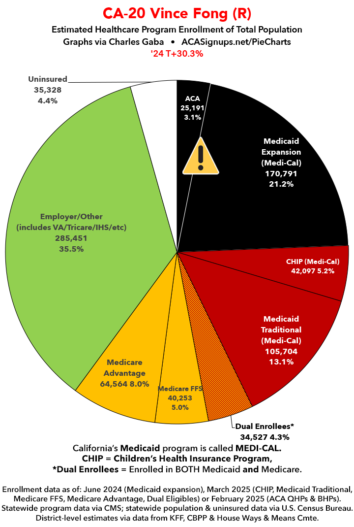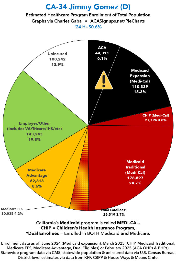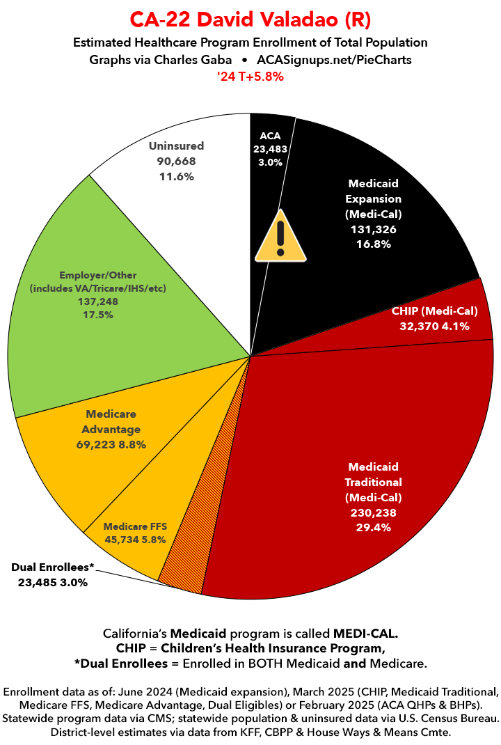 UPDATE 7/2/25: I've updated the web versions of the graphics with the most up-to-date enrollment data I have access to. The black sections w/the ⚠️ symbol are those most at risk of losing healthcare coverage due to H.R. 1, the "One Big Beautiful Bill Act" (aka the #MAGAMurderBill).