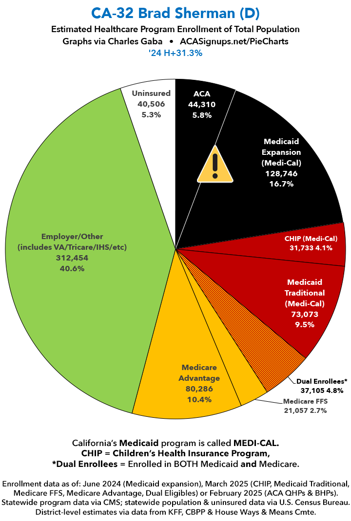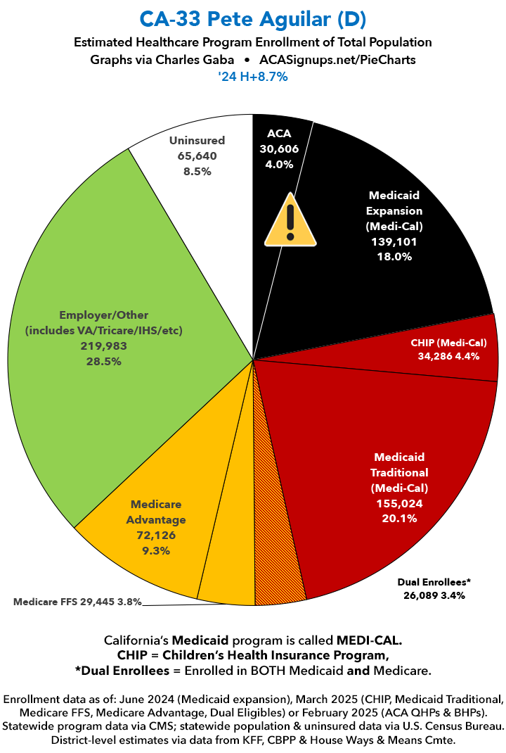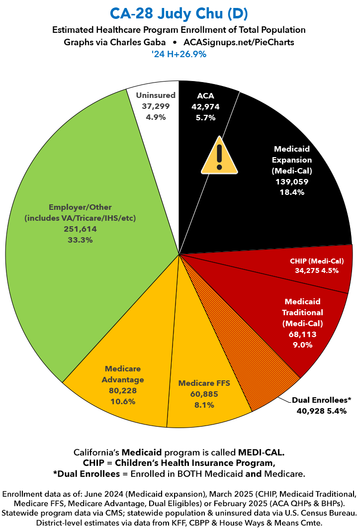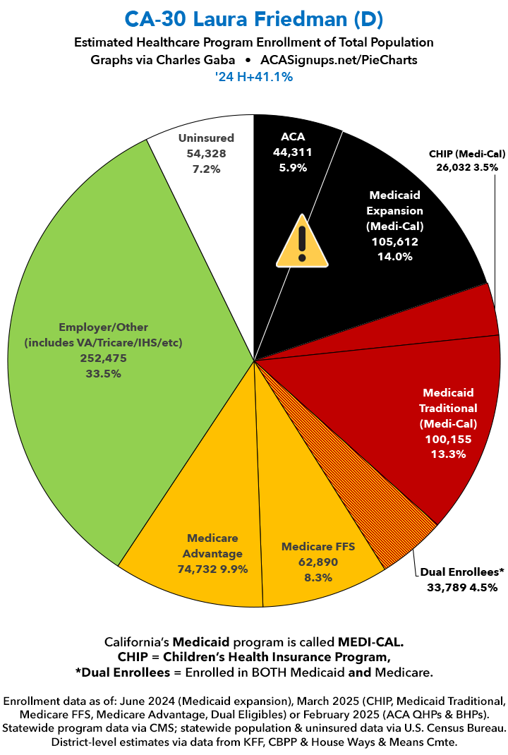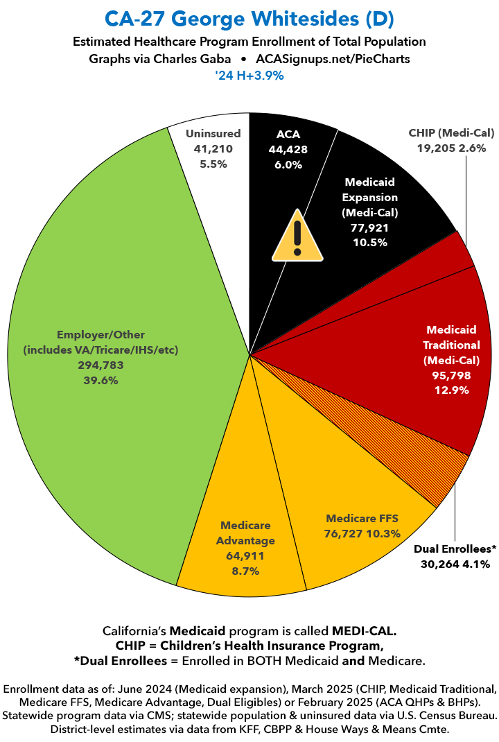 UPDATE 7/2/25: I've updated the web versions of the graphics with the most up-to-date enrollment data I have access to. The black sections w/the ⚠️ symbol are those most at risk of losing healthcare coverage due to H.R. 1, the "One Big Beautiful Bill Act" (aka the #MAGAMurderBill).