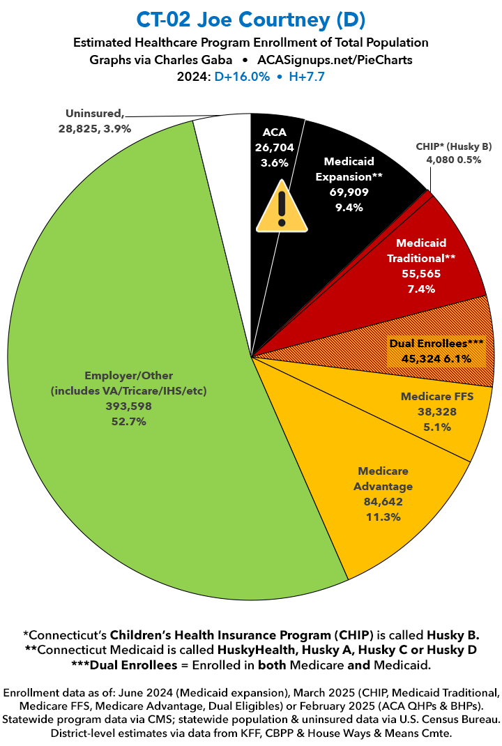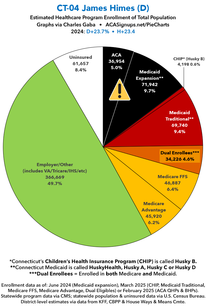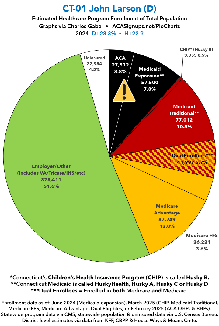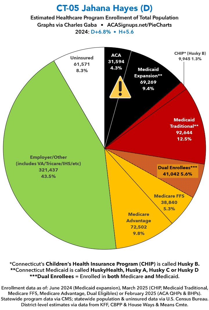 UPDATE 7/16/25: I've updated the web versions of the graphics with the most up-to-date enrollment data I have access to. The black sections w/the ⚠️ symbol are those most at risk of losing healthcare coverage due to H.R. 1, the "One Big Beautiful Bill Act" (aka the #MAGAMurderBill).​​​​​