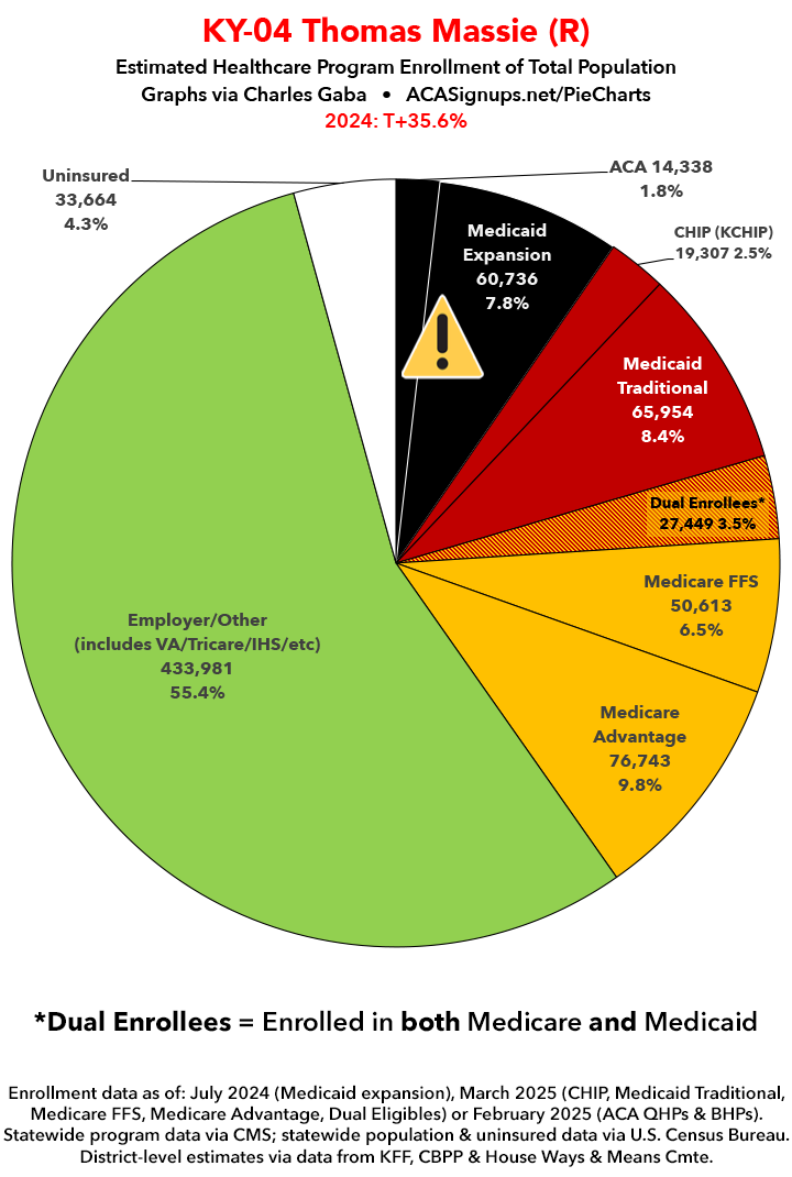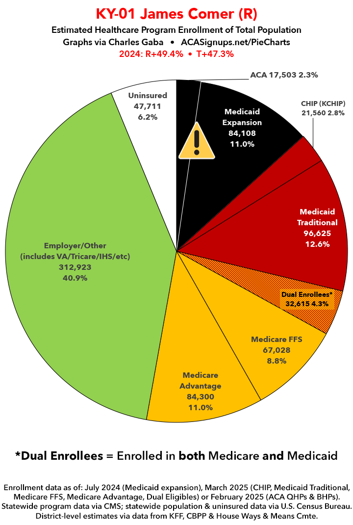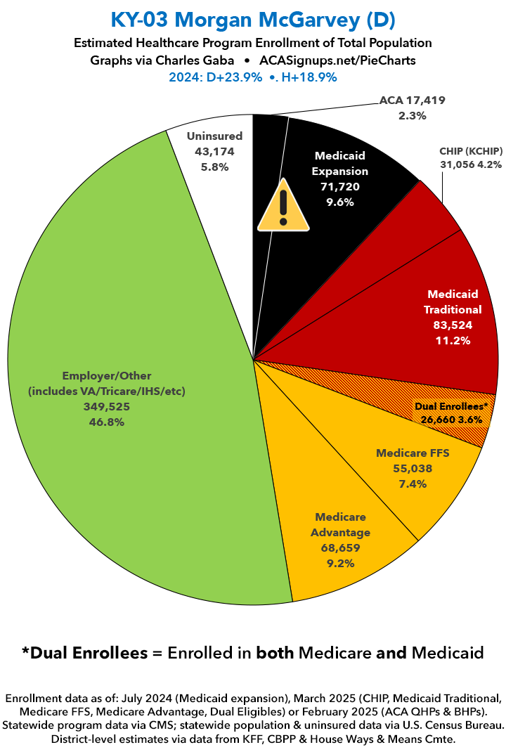 UPDATE 7/5/25: I've updated the web versions of the graphics with the most up-to-date enrollment data I have access to. The black sections w/the ⚠️ symbol are those most at risk of losing healthcare coverage due to H.R. 1, the "One Big Beautiful Bill Act" (aka the #MAGAMurderBill).