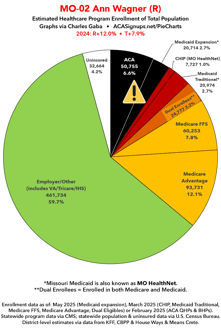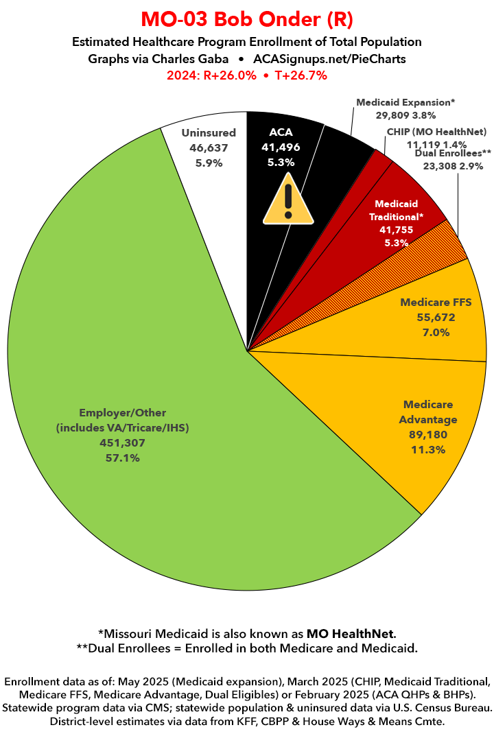 UPDATE 7/6/25: I've updated the web versions of the graphics with the most up-to-date enrollment data I have access to. The black sections w/the ⚠️ symbol are those most at risk of losing healthcare coverage due to H.R. 1, the "One Big Beautiful Bill Act" (aka the #MAGAMurderBill).