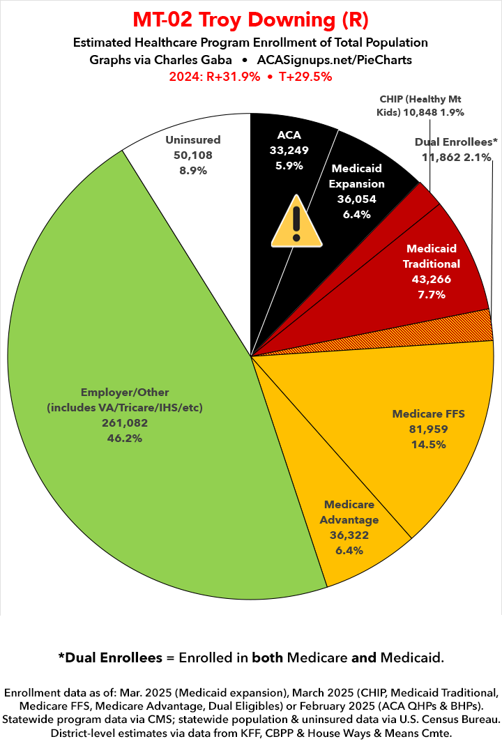 UPDATE 7/6/25: I've updated the web versions of the graphics with the most up-to-date enrollment data I have access to. The black sections w/the ⚠️ symbol are those most at risk of losing healthcare coverage due to H.R. 1, the "One Big Beautiful Bill Act" (aka the #MAGAMurderBill).