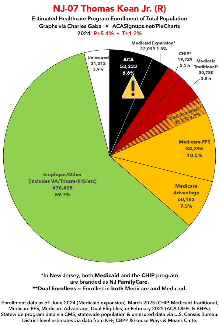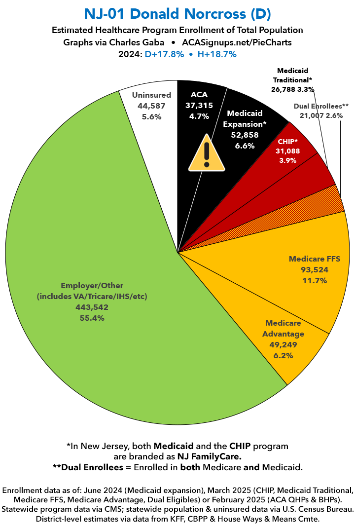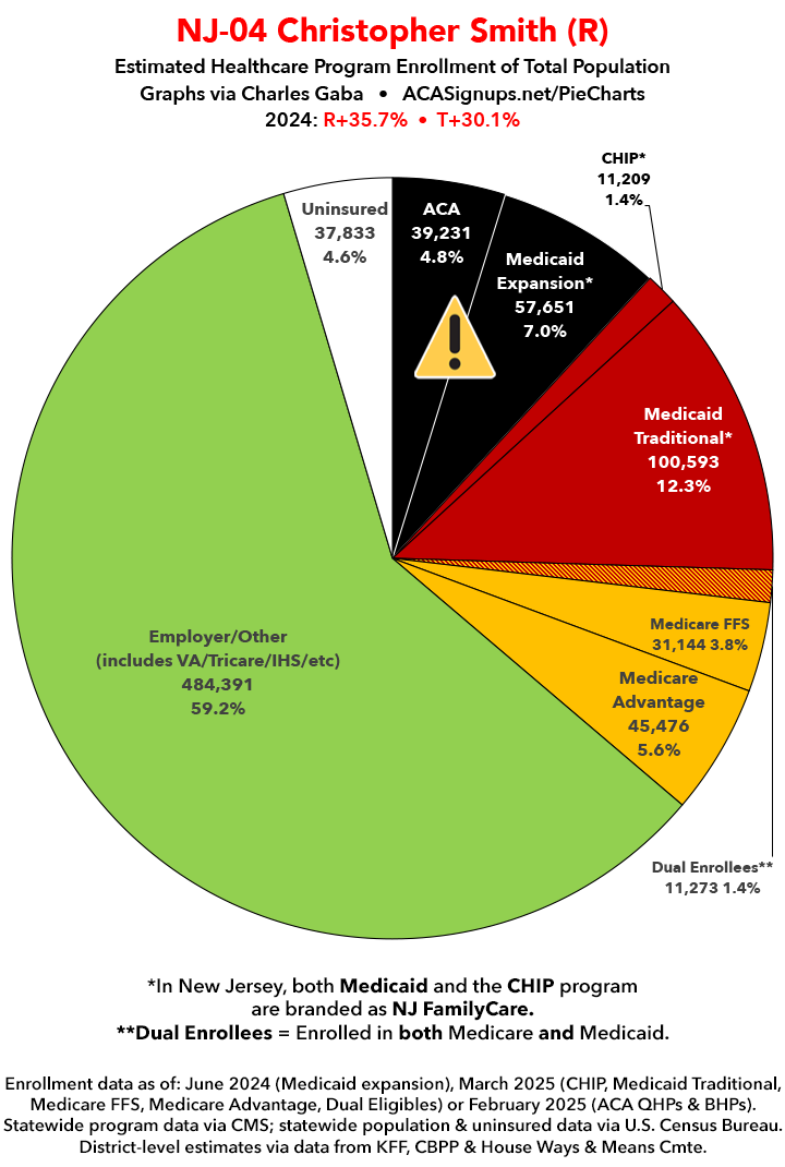 UPDATE 7/8/25: I've updated the web versions of the graphics with the most up-to-date enrollment data I have access to. The black sections w/the ⚠️ symbol are those most at risk of losing healthcare coverage due to H.R. 1, the "One Big Beautiful Bill Act" (aka the #MAGAMurderBill).