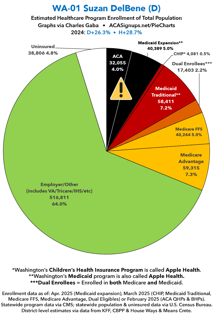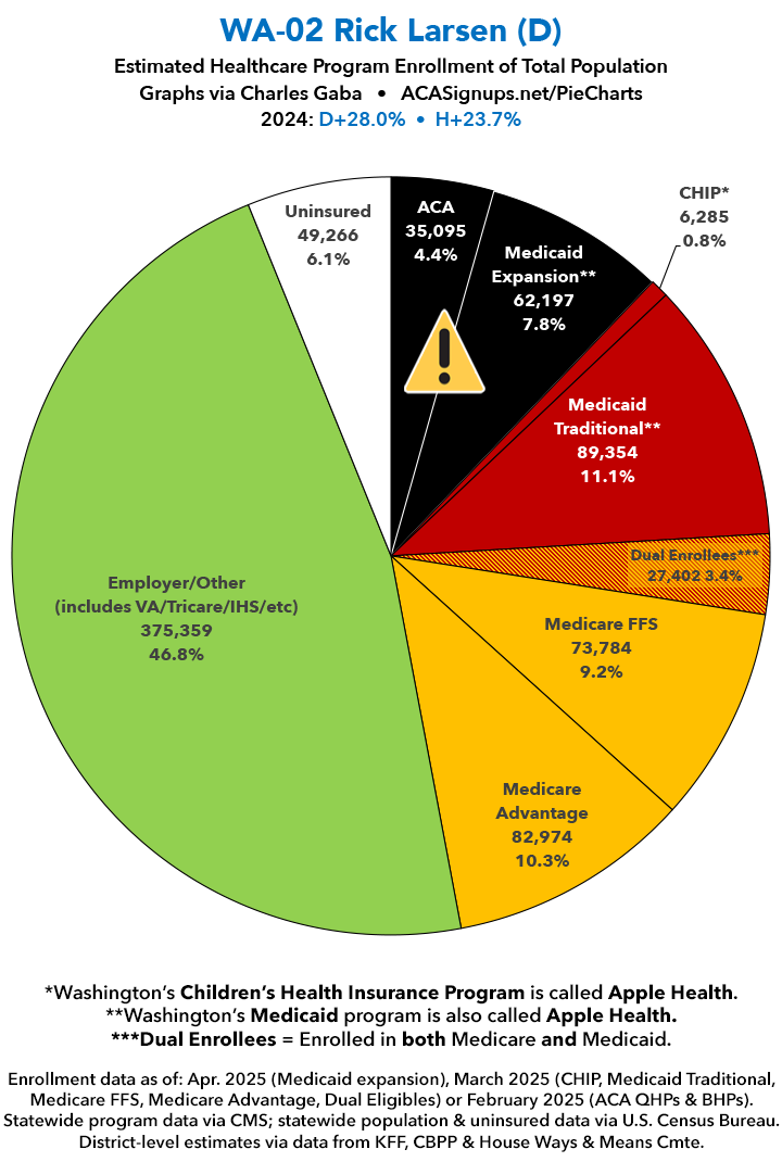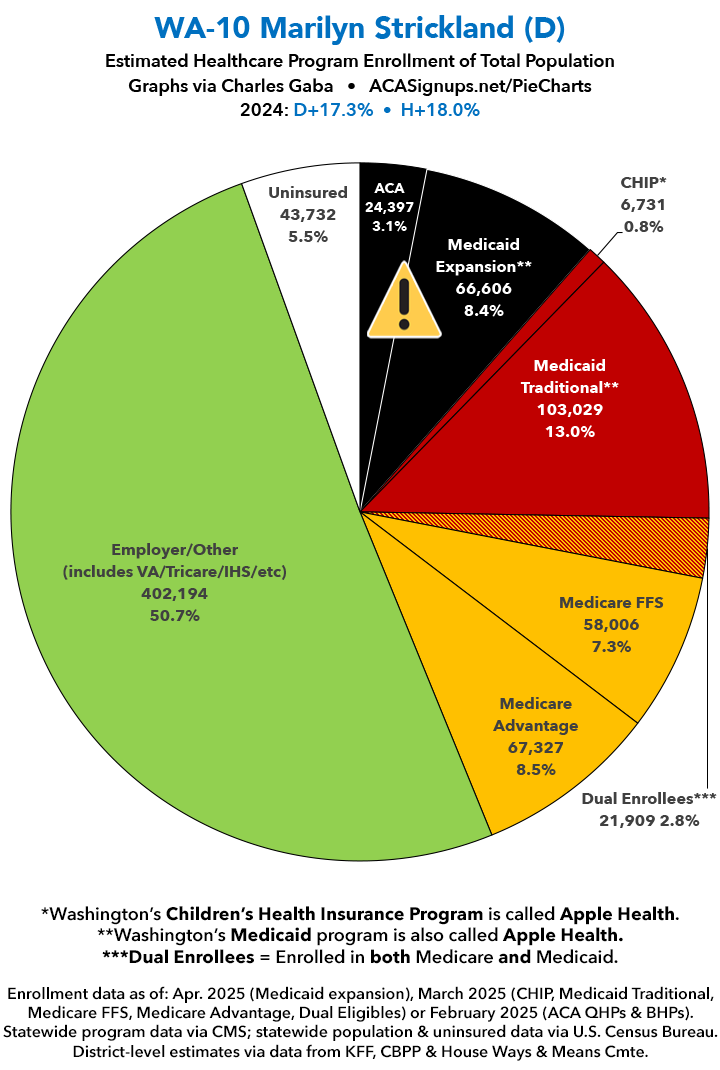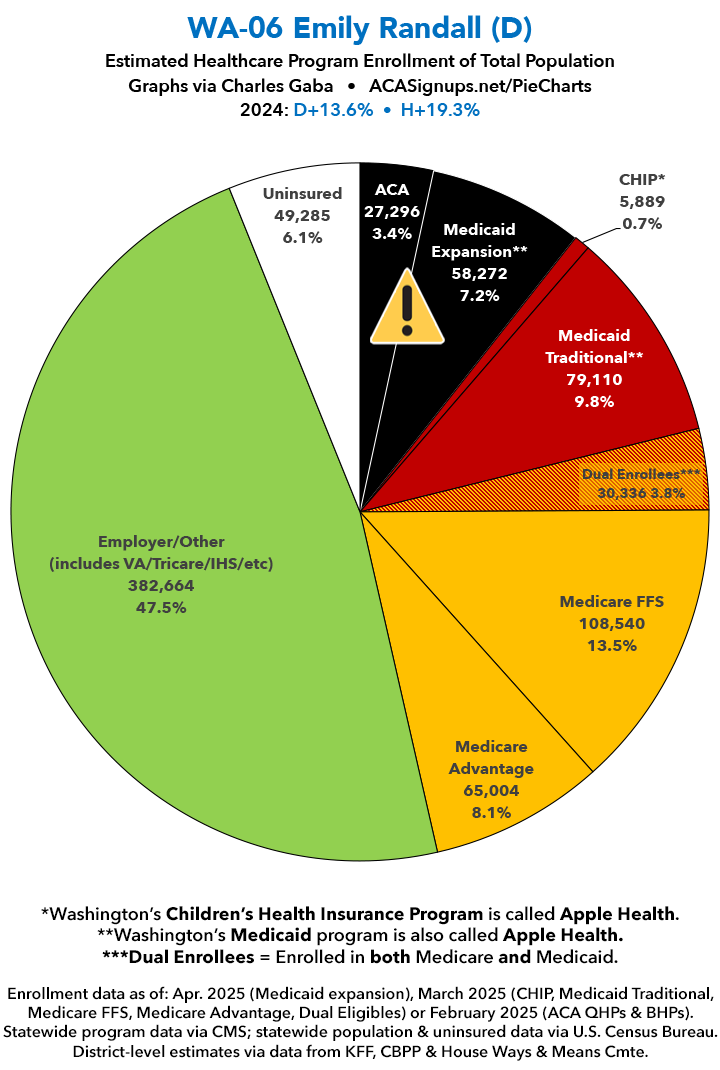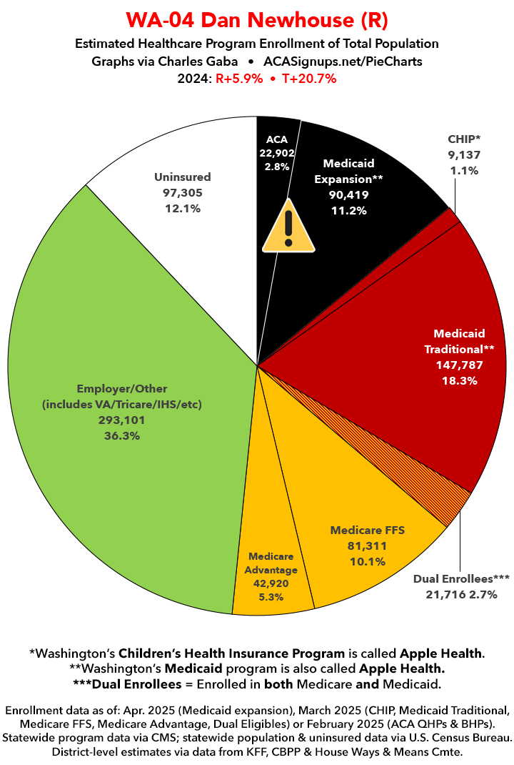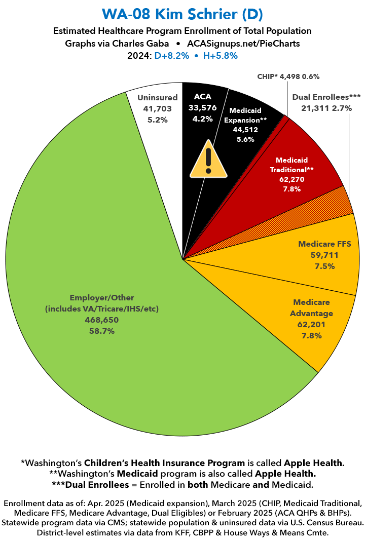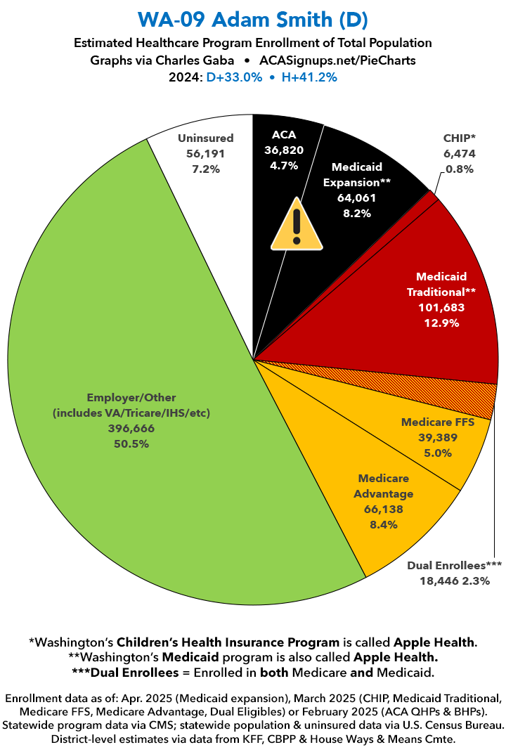 UPDATE 7/15/25: I've updated the web versions of the graphics with the most up-to-date enrollment data I have access to. The black sections w/the ⚠️ symbol are those most at risk of losing healthcare coverage due to H.R. 1, the "One Big Beautiful Bill Act" (aka the #MAGAMurderBill).​​​​​