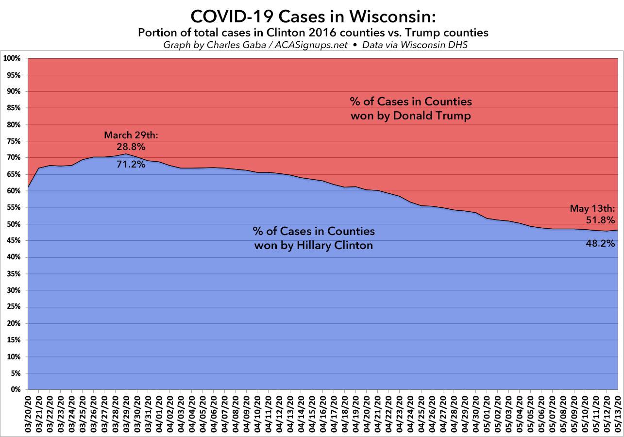 A few weeks ago, I posted a detailed analysis of how the COVID-19 virus has been spreading throughout Wisconsin. I noted that while the outbreak originally spread quickly in the more urban/blue-leaning areas, that has gradually changed over time, with the virus spreading to the rest of the state--including rural, conservative-leaning areas--at a faster rate while it slowed down in the urban areas.