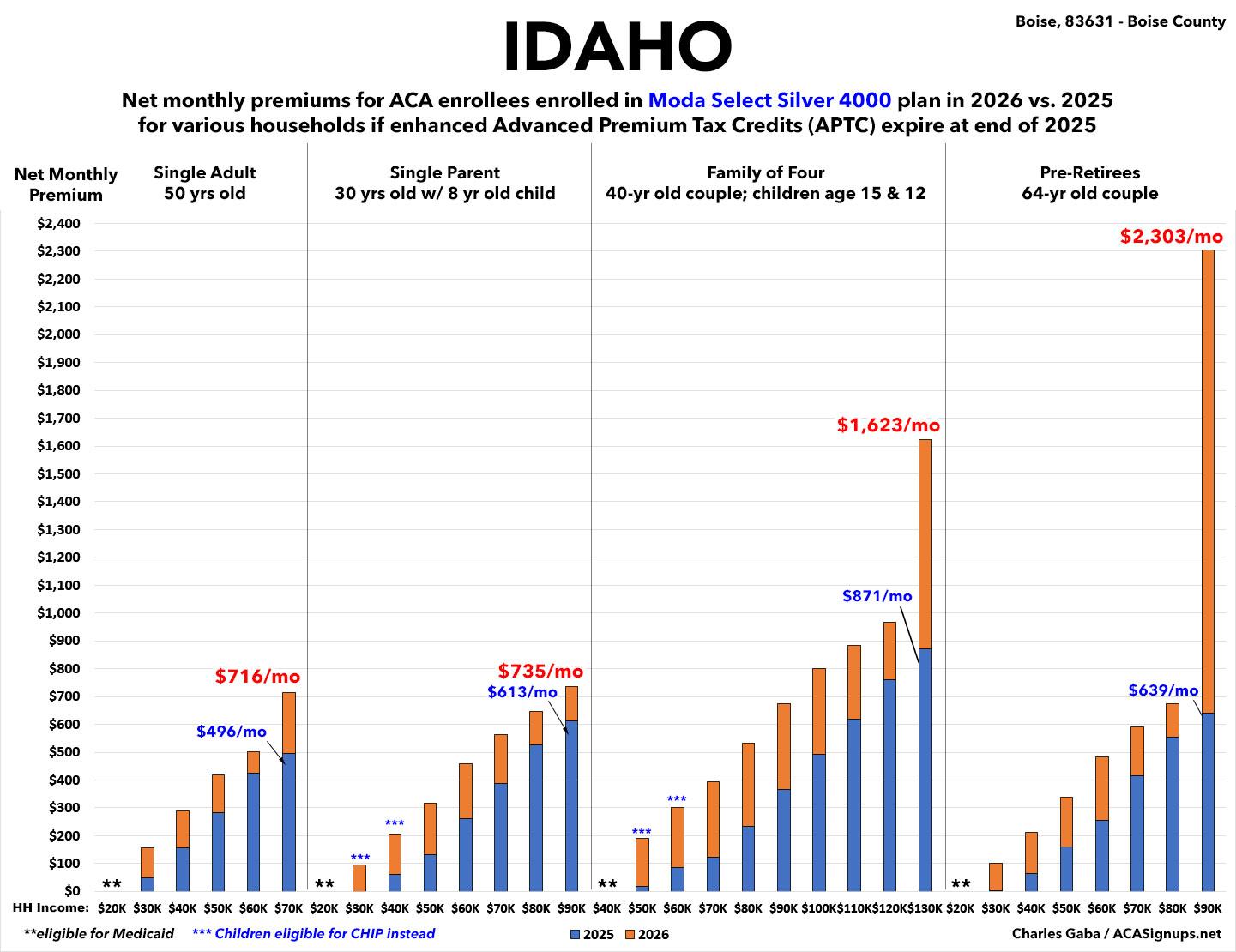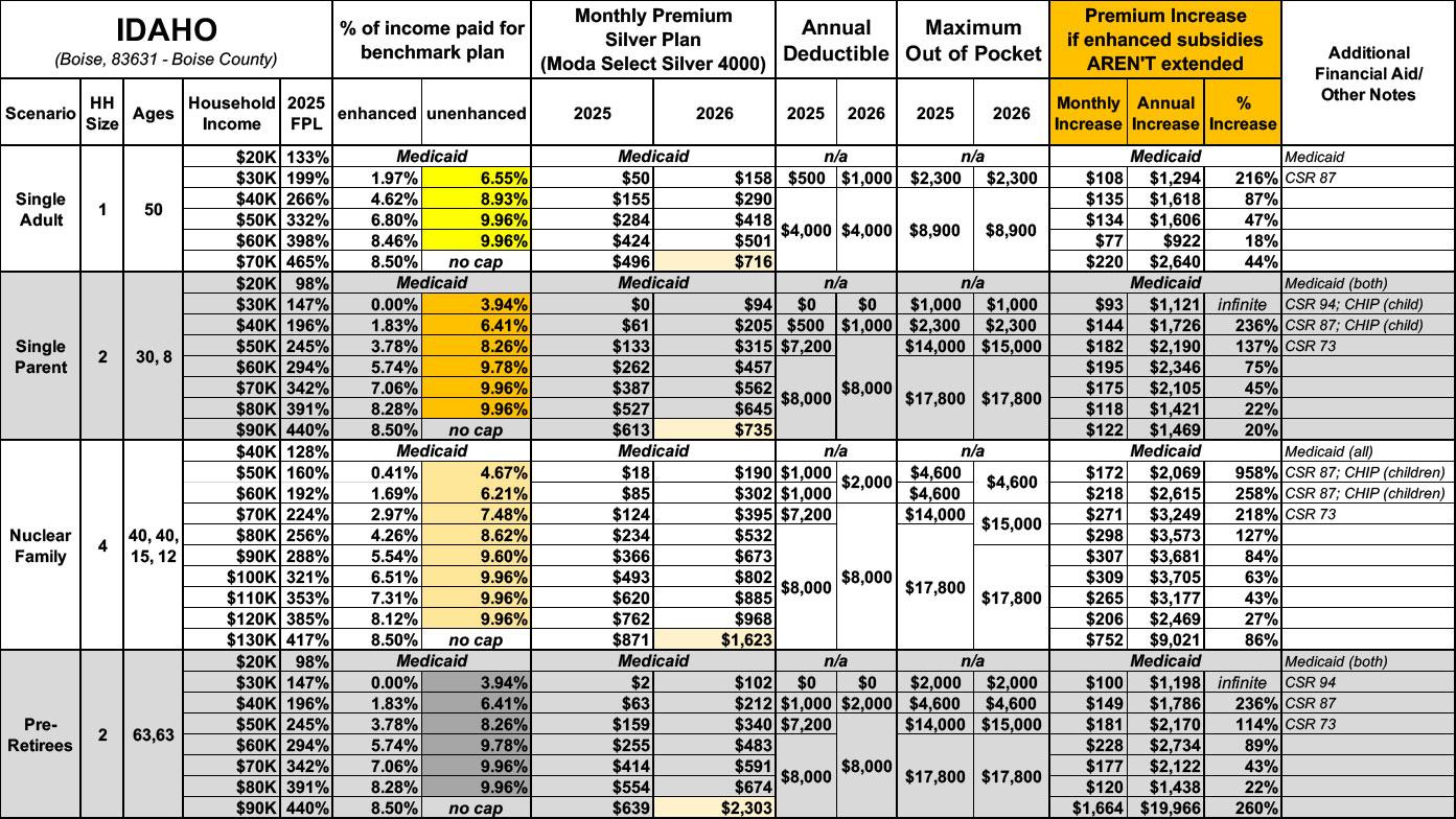 The original version of this analysis included a 4.3% increase in the unsubsidized benchmark plan premium based on a projection by the Congressional Budget Office. However, that was a national average projection which didn’t take into account other factors like increased utilization, medical inflation and so on. This updated version assumes the actual 2026 Idaho rate filings.