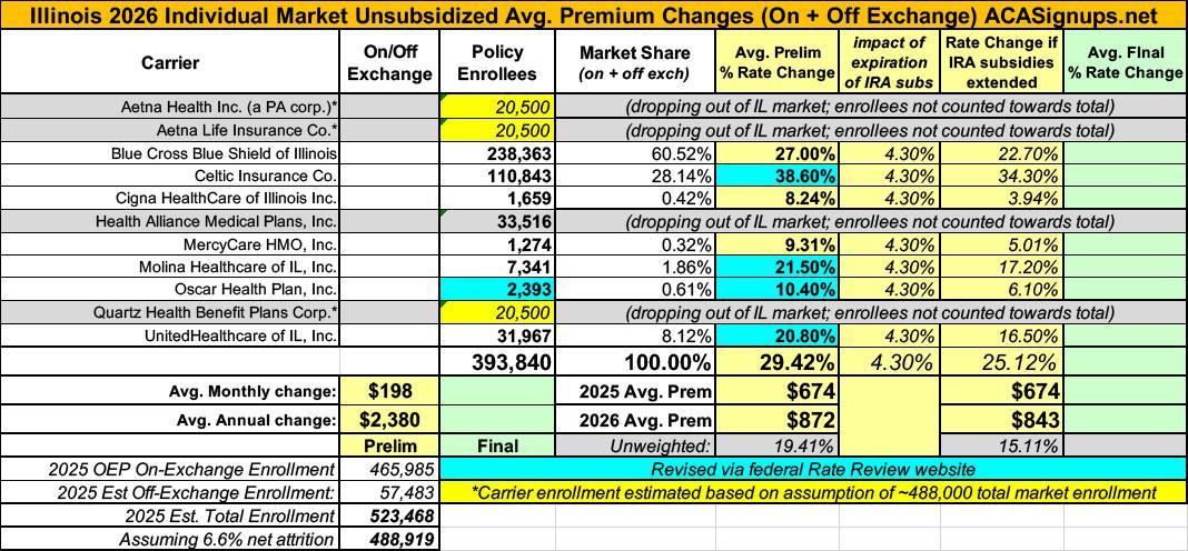 Illinois has around ~466,000 residents enrolled in ACA exchange plans, 90% of whom are currently subsidized. I estimate they also have another ~57,000 unsubsidized off-exchange enrollees.