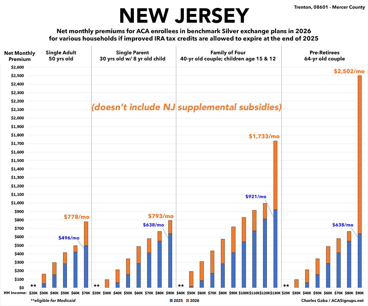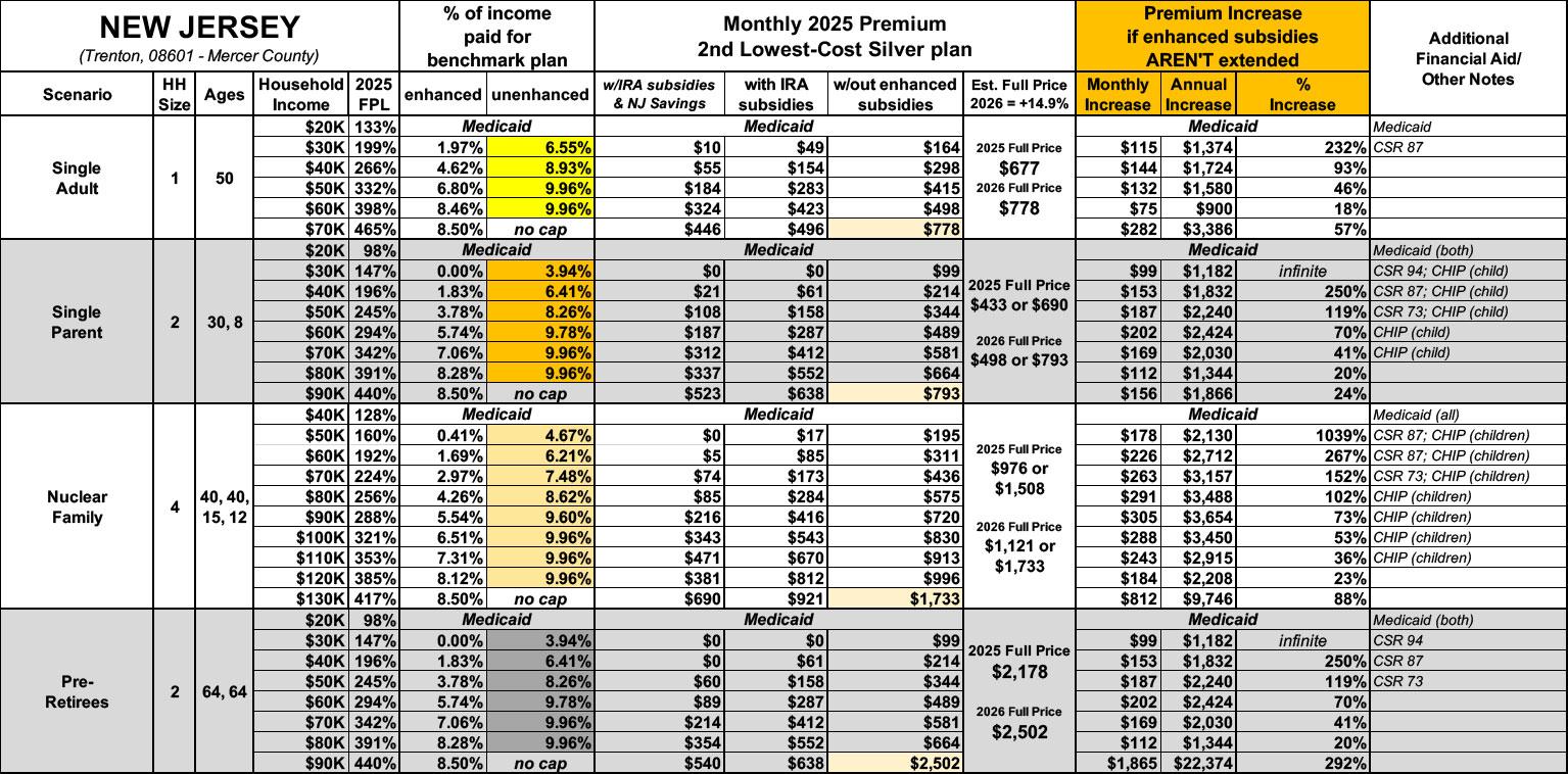New Jersey has their own state-level supplementary premium subsidy program on top of the federal one, but I'm not sure how that will be impacted by the IRA subsidies expiring. I've included these in the table below but not on the graph at the bottom of this entry.