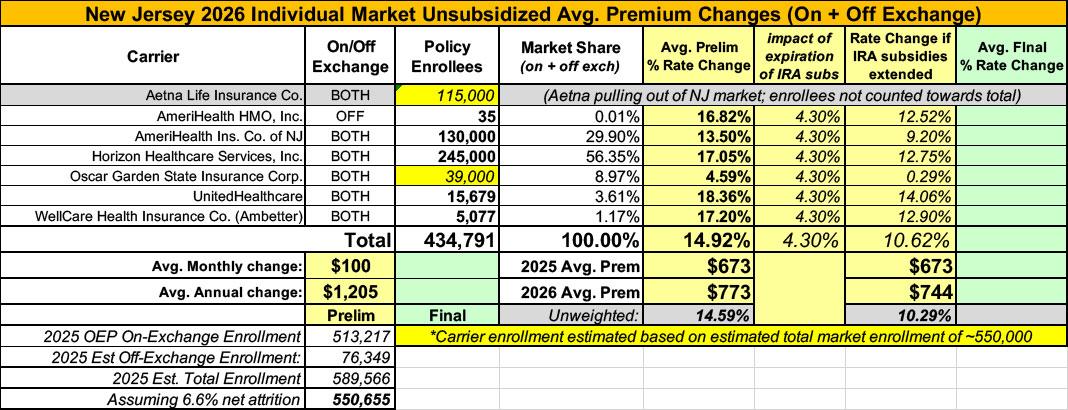 New Jersey has around ~513,000 residents enrolled in ACA exchange plans, 85% of whom are currently subsidized. I estimate they also have another ~76,000 unsubsidized off-exchange enrollees.