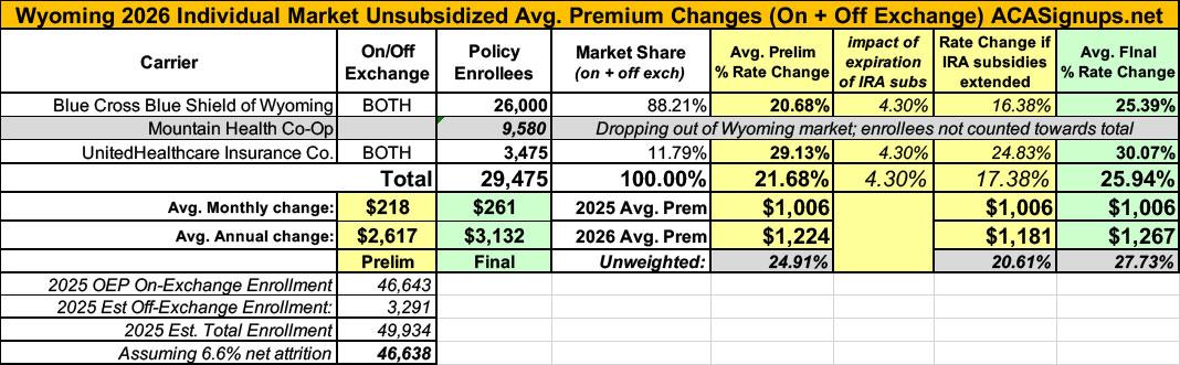 NEW: The original version of this analysis included a 4.3% increase in the unsubsidized benchmark plan premium based on a projection by the Congressional Budget Office. However, that was a national average projection which didn’t take into account other factors like increased utilization, medical inflation and so on. This updated version assumes the actual 2026 Wyoming rate filings.