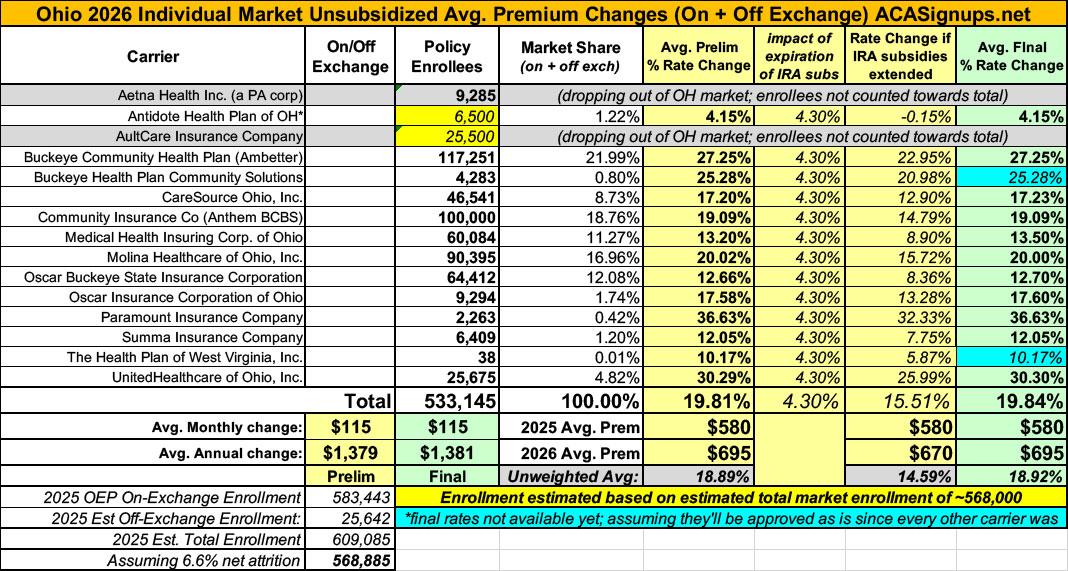 Ohio's total 2025 OEP enrollment was ~583,000 people, and using 2024 CMS liability risk score data, I estimate another ~26,000 off-exchange enrollees, or ~609,000 total.