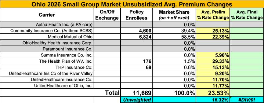 Meanwhile, I have no enrollment data at all for most of the small group carriers; the unweighted average 2026 rate hike there is around 16.3%