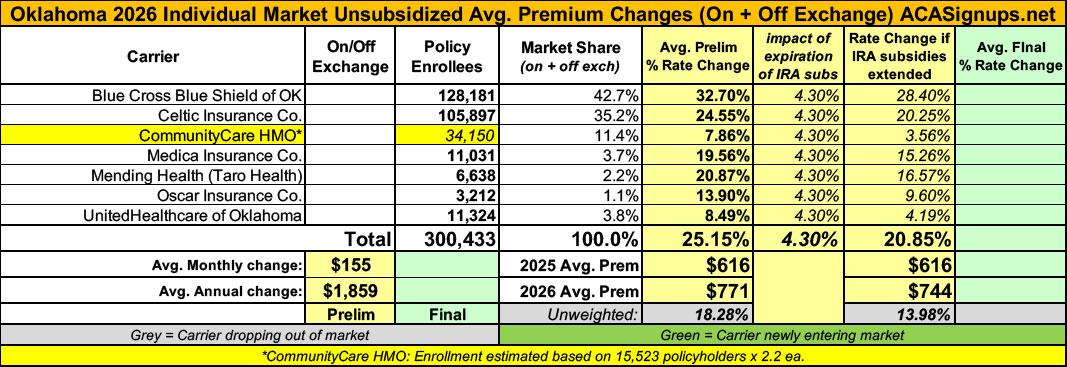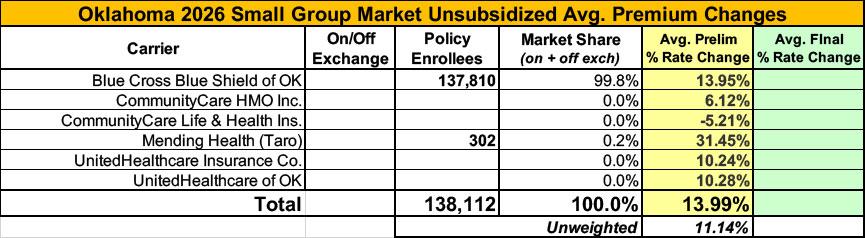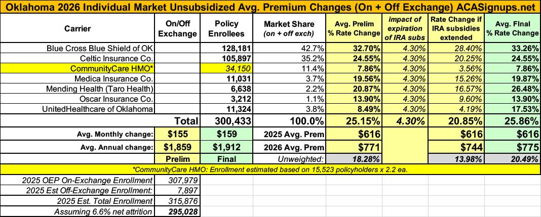 2026 Final Gross Rate Changes - Oklahoma: +25.9%; ~315,000 enrollees facing MASSIVE rate hikes (updated)