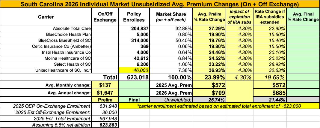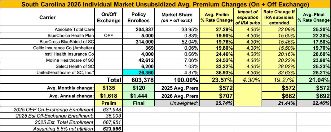 2026 Final Gross Rate Changes - South Carolina: +21.0%; over 600,000 enrollees facing MASSIVE rate hikes (updated)