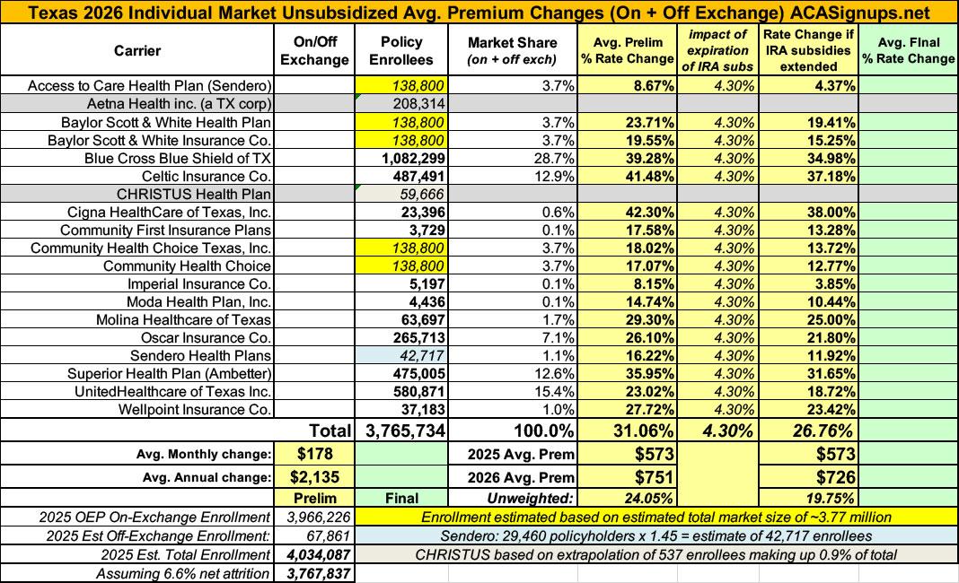 Also, it turns out CHRISTUS is not dropping out of the TX individual market after all; I've filled in their numbers as well.