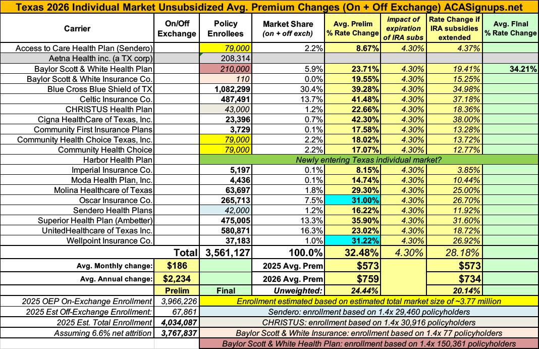 UPDATE 11/02/25: Just hours ahead of Open Enrollment launching, Texas insurance carriers had their final, approved rate filing decisions published to the federal rate review database. In addition to several significant changes to carrier filing averages, I was also able to get the actual enrollment data for two more carriers. Overall, the weighted average rate increase moved up by over two points to +34.7%.