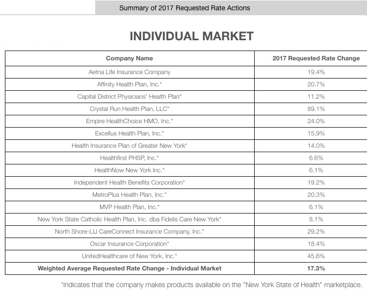 And there you have it: A weighted average requested rate increase of 17.3% across the entire state's ACA-compliant individual market. Remember that NY never allowed transitional plans anyway, and there are likely only a handful of grandfathered plans left on the individual market, so this should cover well over 90% of the market.