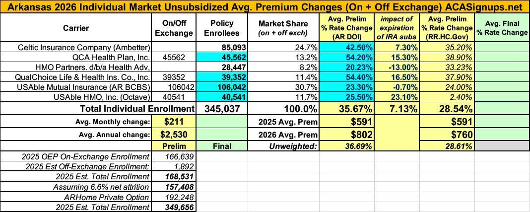 Back in July I posted my analysis of the preliminary 2026 rate filings by the 6 Arkansas insurance carriers participating in the individual market. At the time, they looked like this: