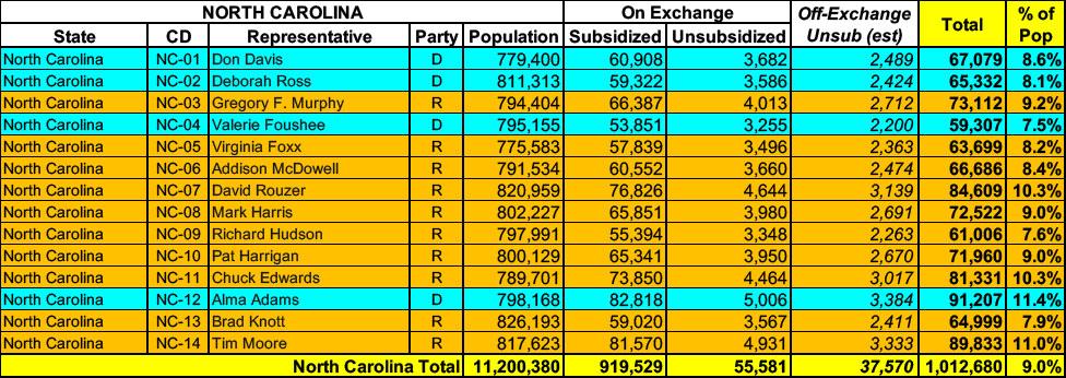 North Carolina has around ~975,000 residents enrolled in ACA exchange plans, 94% of whom are currently subsidized. I estimate they also have another ~37,000 unsubsidized off-exchange enrollees.