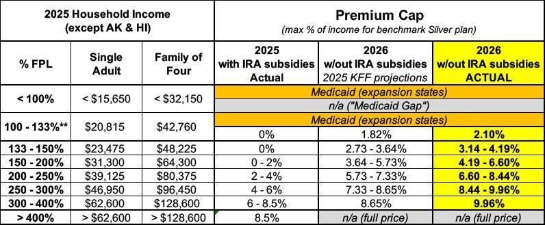 Regarding the chart below which he reposted comparing the original ACA subsidy scale to the current version: You probably think that if the enhanced subsidies expire it will revert back to the original version, which would be bad enough. In fact, however, the Trump Regime has also made THAT version even worse, like so: